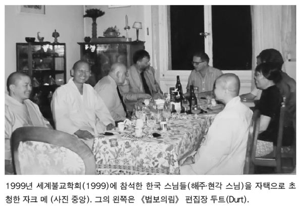 1982년 필자는 카뮈의 실존주의철학과 대승 불교철학의 비교연구를 주제로 파리 유학 중이었는데, 송광사 구산 스님의 외국인 제자인 프랑스 출신 혜행(慧行, Renau Neuvauer) 스님의 소개로 자크 메 교수를 만났다. 자크 메 교수에게서 깊은 인상을 받은 필자는 인도불교의 중관학에도 관심이 있었기에 로잔대학 박사과정으로 학교를 옮겼다.